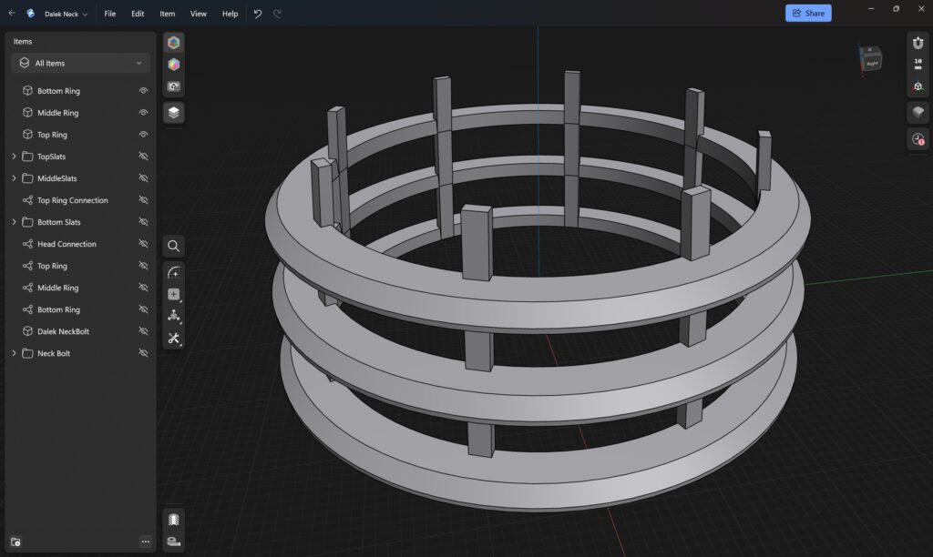 Progress has greatly slowed on the Dalek. Partly due to other in-progress projects, and partly due to dreading attempting to 3D model the “shoulder” section.