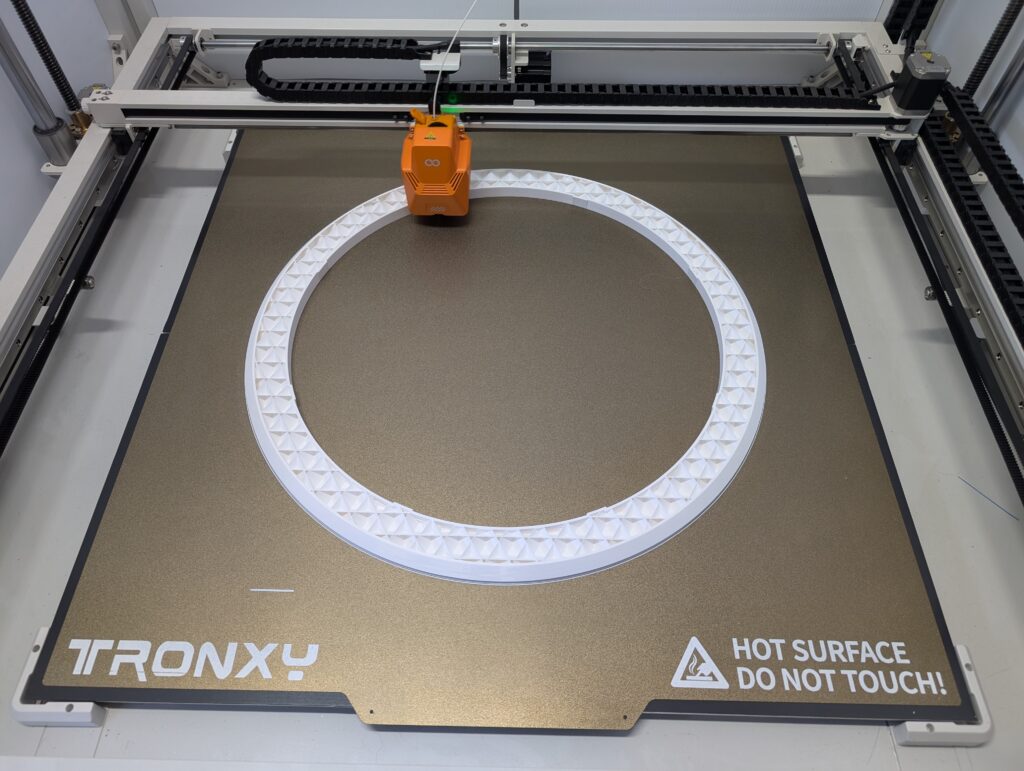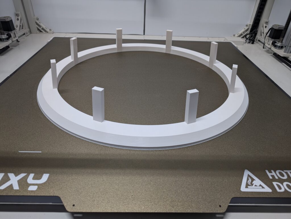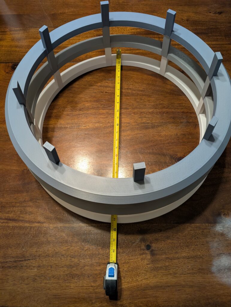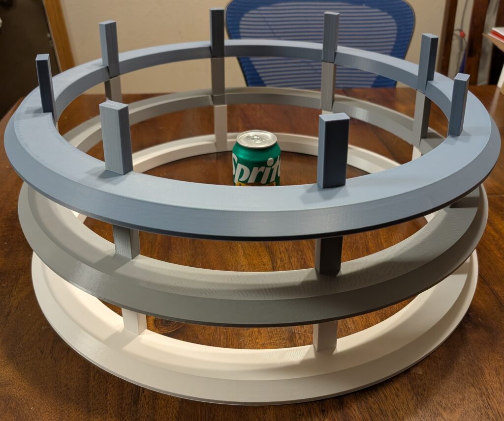 I did get the neck rings and “bolts” designed and printed. My big printer was a bit obstinate (as usual), and one of the rings failed midway through, with the printer just stopping mid-print for no apparent reason. I did manage to get all three printed, and they are huge at almost two feet in diameter, and about 3/4 of a roll of filament each (750g).